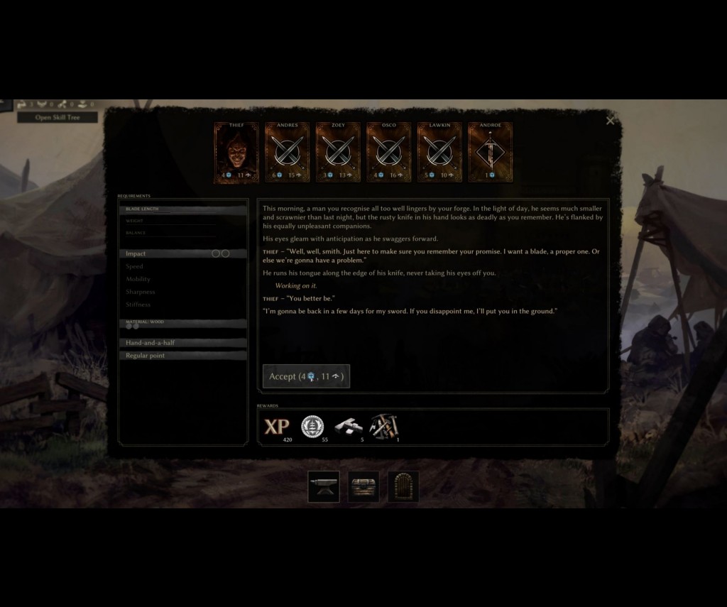 The only upside here is the generous amount of XP awarded for completing story missions, compared with the far lower amount you get for completing the other randomized daily tasks. XP can be spent unlocking new items on the skill tree. Learning how to forge curved swords, as opposed to only traditional blades before, was quite fun, as was learning engraving. Nothing like adding a bit of decoration on an already finely-honed blade.