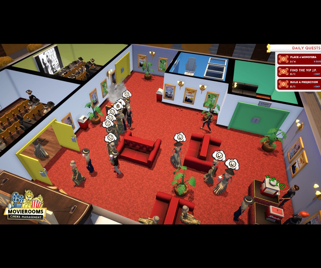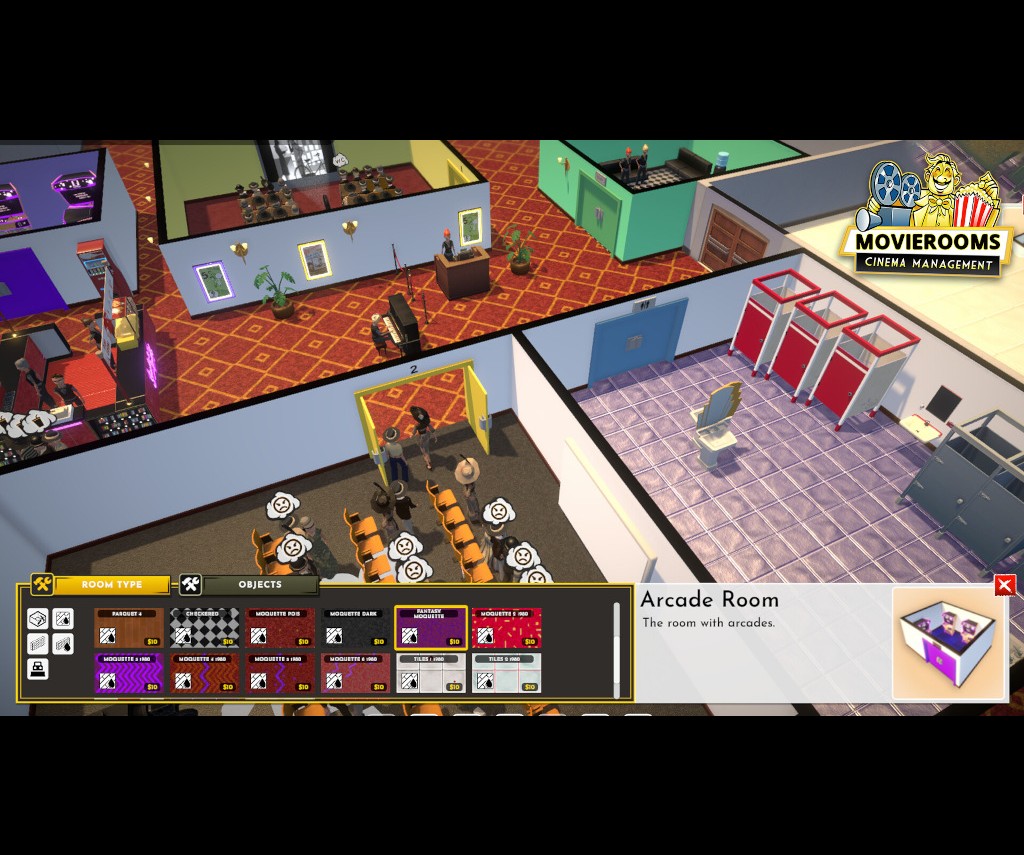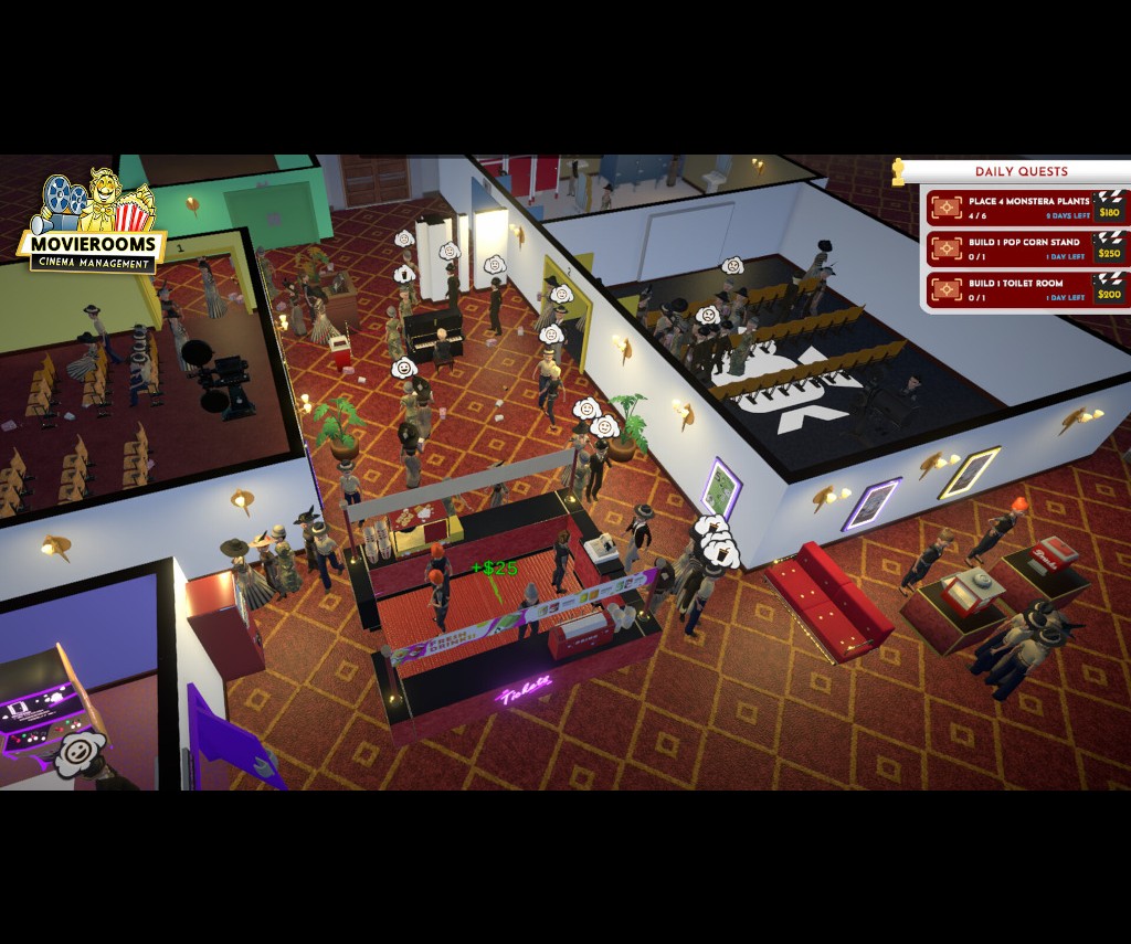 Sandbox Mode is included in the full version of the game with the initial part of the Historic Mode containing elements of sandbox as a tutorial. However, in sandbox players will have the option to pick and present to your customers various movies from history with no historical time line involvement. This would include 1919 silent pictures along with 1990s and beyond fare being available. The same with movie projecting equipment. After building a cinema and hiring the necessary staff, such as projectionist, ticket seller, maintenance person, etc., it will be time to open up and start making money by selling tickets; along with selling the general movie going fare of pop corn and candy. Make note that keeping employees and patrons happy is a big part of game play.