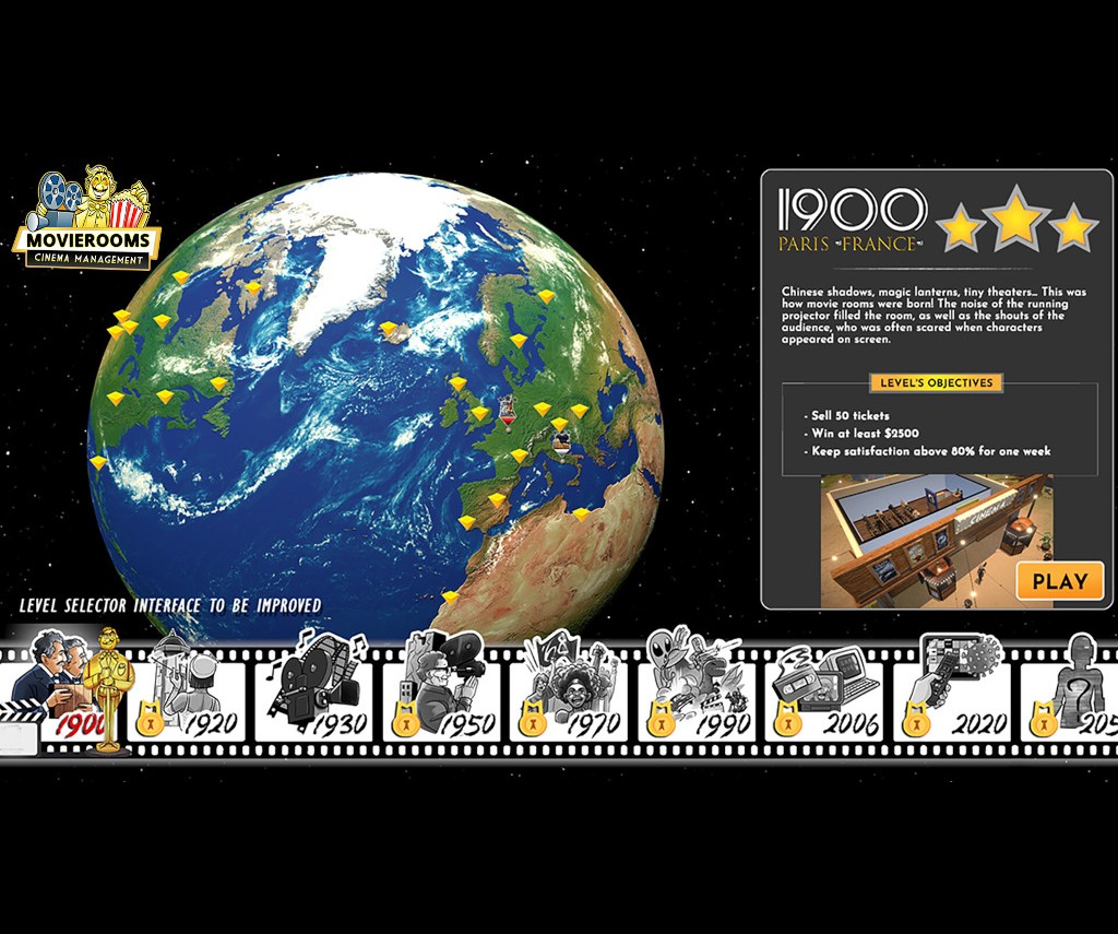 The game we're taking a look at in this first look is Movierooms - Cinema Management - a sim by Indie game studio Mad Pumpkins. Mad Pumpkins consists of a small team of programmers based in the countries of Italy, France and Portugal. Their main focus as a company, which I took from their web site states: "The studio excels in a wide range of expertise, including development, prototyping and consulting for video game applications and software. The company supports schools and businesses with integration and gamification being included in their training processes." That information is important because it indicates the type of game you can expect to be purchasing. In this case, game play takes a historical look at movie history from beginning to present day with the game player being a movie cinema proprietor.