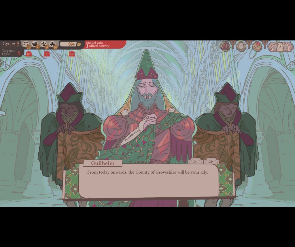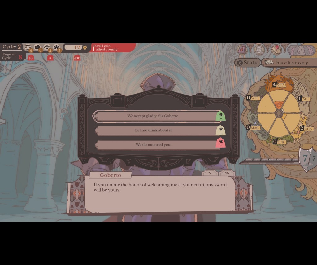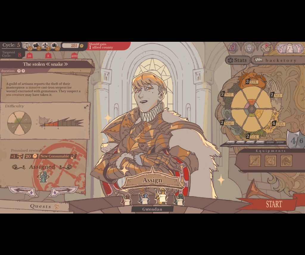 Once the court is adjourned, the real strategy begins in the Round Table room. Solving the realm's problems requires deploying your knights, but this is far more than a simple numerical check. While you must match a knight's specific stats to the visible traits of a quest, you also have to navigate their complex personalities. Your knights aren't just tools; they have preferences, and assigning them to tasks they loathe will sour your relationship. Over time, these assignments affect your standing with them, which can evolve into deep friendships or even romances, making it vital to keep them personally "interested" to ensure long-term loyalty.