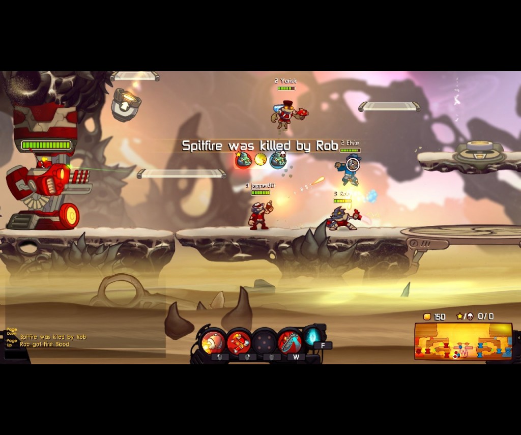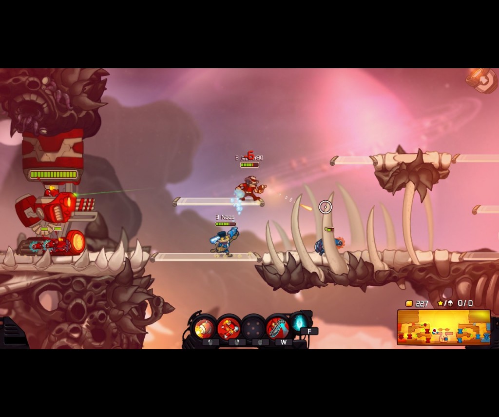 Visually, Awesomenauts has me reminiscing of the Amiga era of gaming. Although the graphics are clearly sharper than in those days, the style seems reminiscent of the classic Bitmap Bros games. The characters in gameplay could have come straight from Speedball 2. The various backgrounds too have a somewhat retro 2D side scrolling platform look to them and full of colour. Combined with the simple controls and you could be mistaken for thinking it was a game directly from the early nineties.