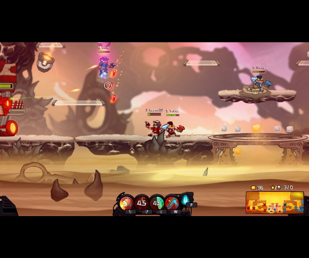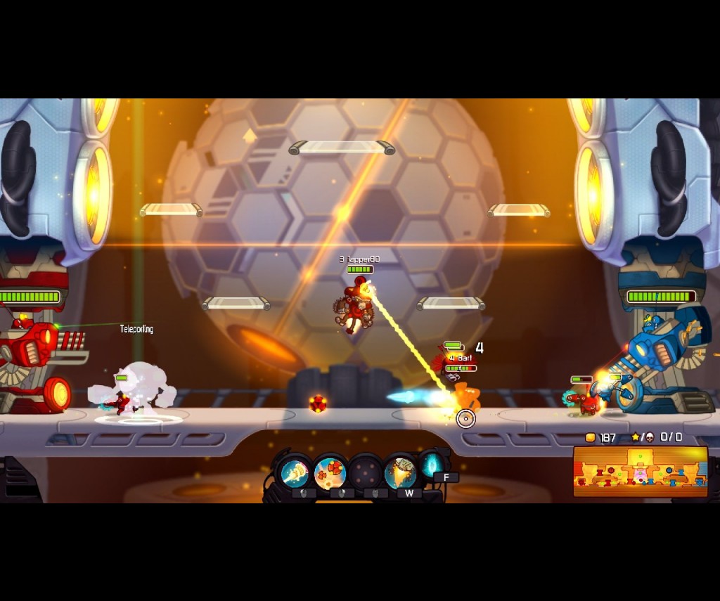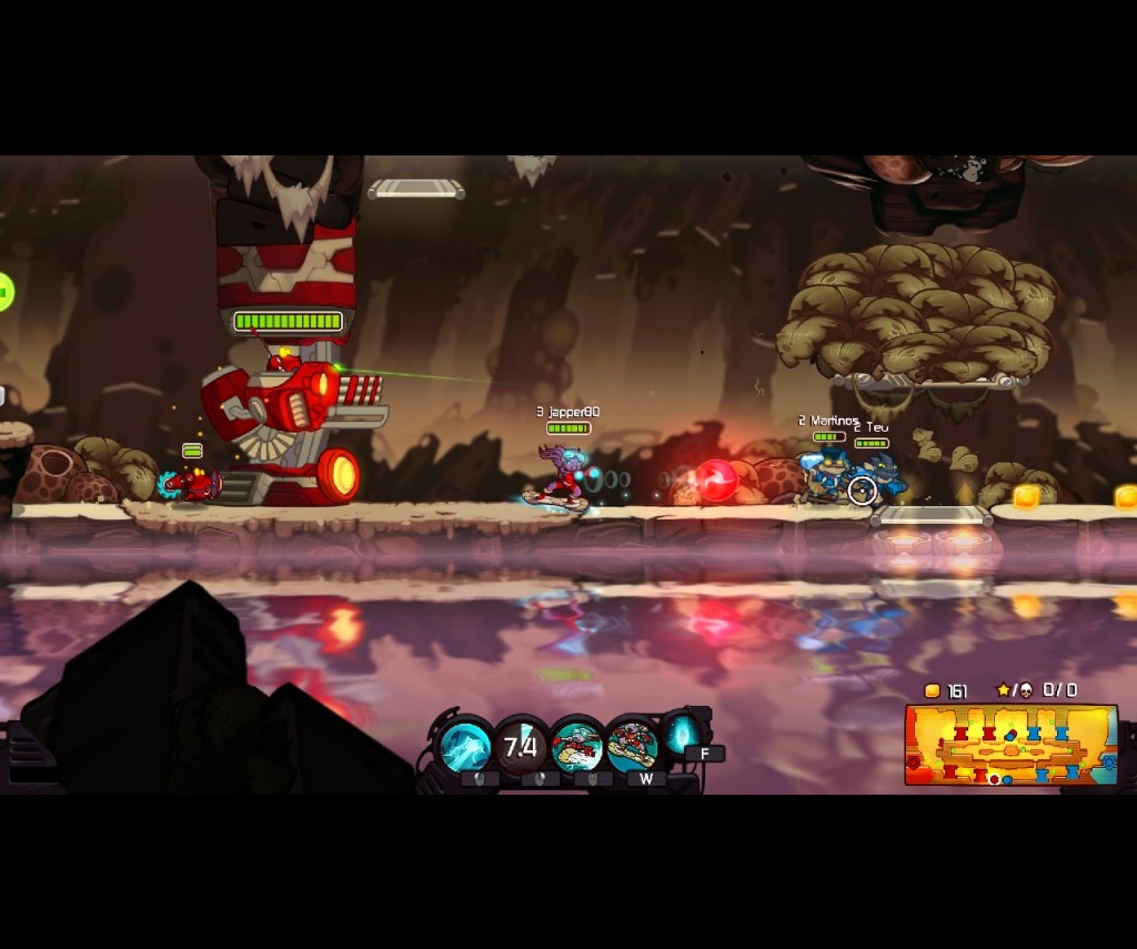 For those unfamiliar with the console versions, gamers in Awesomenauts get to choose from one of eight playable characters (up from the six originally available on the console versions). Although some are initially unavailable, each has their own back-story and unique talents and abilities. Froggy G, for instance, is a fast moving melee fighter with a special charging attack. Lonestar, a galactic cowboy, is a bit slower but can shoot from a distance, can throw sticks of dynamite and can summon a hologram bull that can clear enemies from his path. Voltar is another medium speed characters, but can heal both himself and his allies and can create special robotic drones that will fight for him.