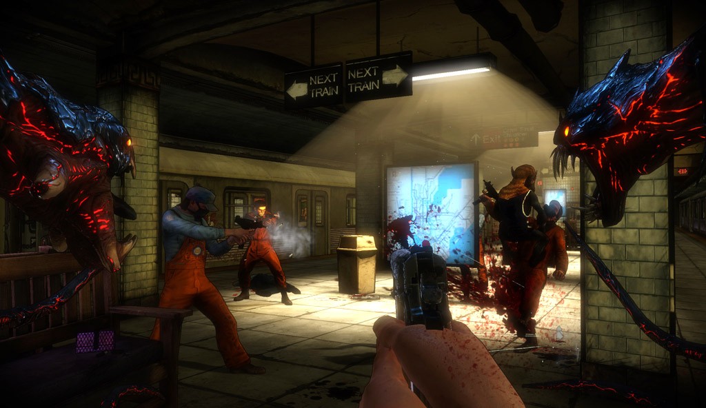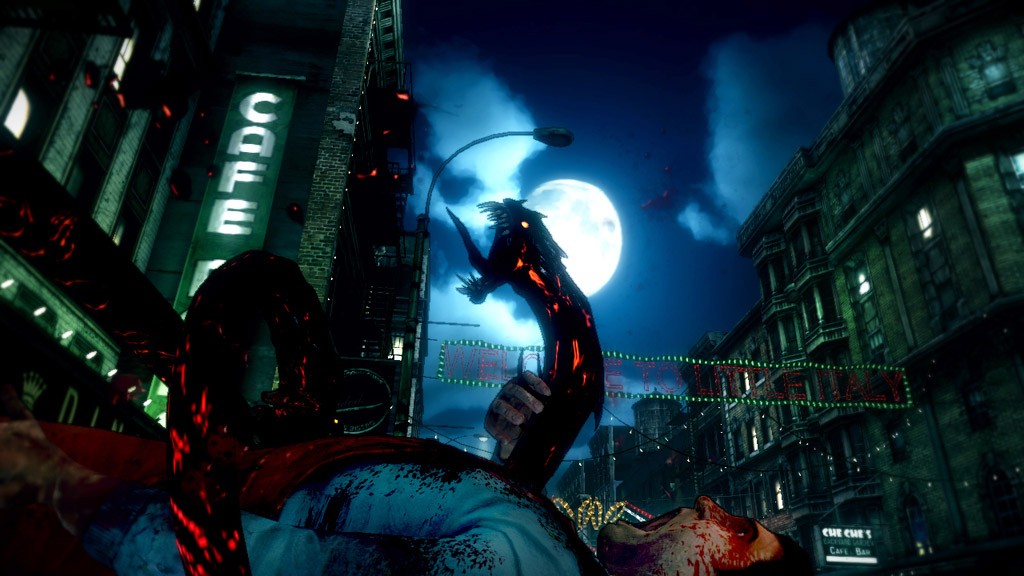 In the first game, the Darkness was relegated to several different abilities. The Darkness could manifest as eel-like tendrils that could be used to attack enemies or throw objects, summon impish Darklings that attacked enemies, send out tendrils to scout ahead locations and take out enemies, and even create a black hole that sucked up anything near it. These Darkness powers were always separate from the gun combat, meaning Jackie would have to switch from guns to the Darkness mid-combat to make use of his powers. Two years older and wiser, Jackie no longer has to worry about such trivial issues. Thanks to what the developers are calling ‘quad-wielding,’ Jackie can use guns and the Darkness at the same time, creating possibly the most badass way to create havoc possible. While gunplay will use the standard shoulder buttons (depending on whether you’re using two pistols or a two-handed weapon like a shotgun), the Darkness will be controlled using the right and left bumpers. The Darklings also play a more important role in the sequel. Instead of having a variety of Darklings to choose from there will just be one who plays a role in the story. Unsurprisingly, the Darkling will act as a sort of comic-relief in that it can urinate acid on enemies. The Darkness II also looks noticeably more violent than the first game, with Jackie using the Darkness to rip enemies in two and perform other finishing moves, such as the “Anaconda,” which is perhaps best left to the imagination. The environment will also be a factor, as Jackie can throw nearby signs or parking meters to impale enemies. The Darkness isn’t all offense though, as Jackie can also use the Darkness to rip off car doors or other pieces of the environment to create a makeshift shield.