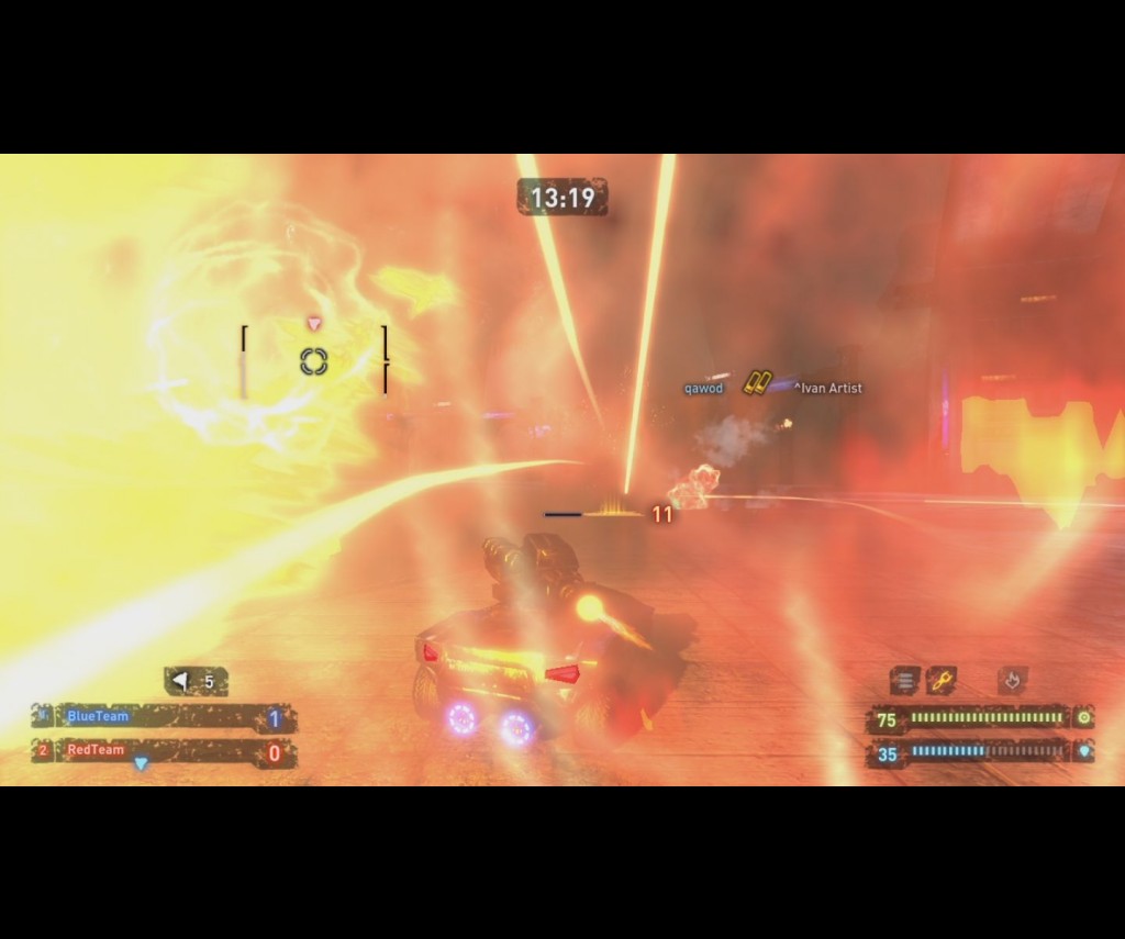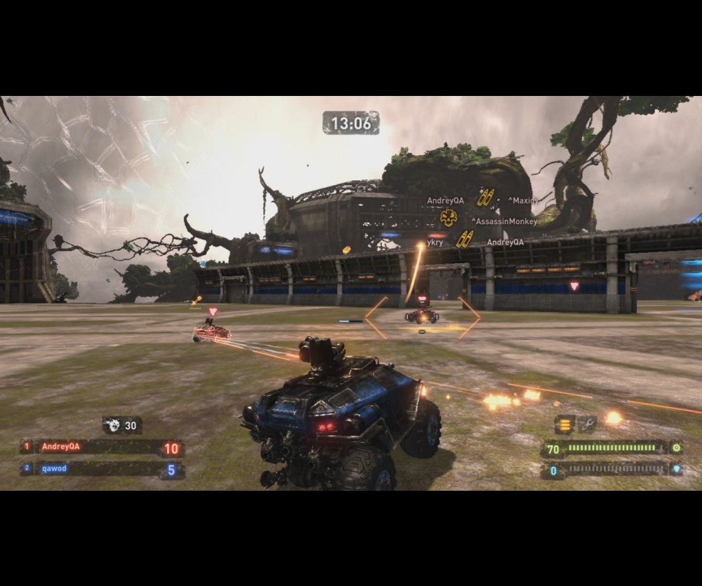 The cars are split into five different classes: ‘Soldier’, an all around fighting machine; ‘Assassin’, a fast but weak car stocked with ammunition; ‘Scout’, another fast but weak car with jet boosters which makes it perfect for hit and run attacks at the enemy flag; ‘Engineer’, a well shielded jet powered car with an enhanced radar system which allows him to see enemy locations all over the map; and last but not least, ‘Heavy’, a slow, heavily shielded tank on four wheels. The cars look alright when you first get a hold of them, but when you acquire a shield, lights appear on its surface, giving it a very nice Tron-like appearance. The visuals in this game are very well done and I’d honestly say that they deserve to keep their jobs. Everyone else, however, might want to update their CVs.