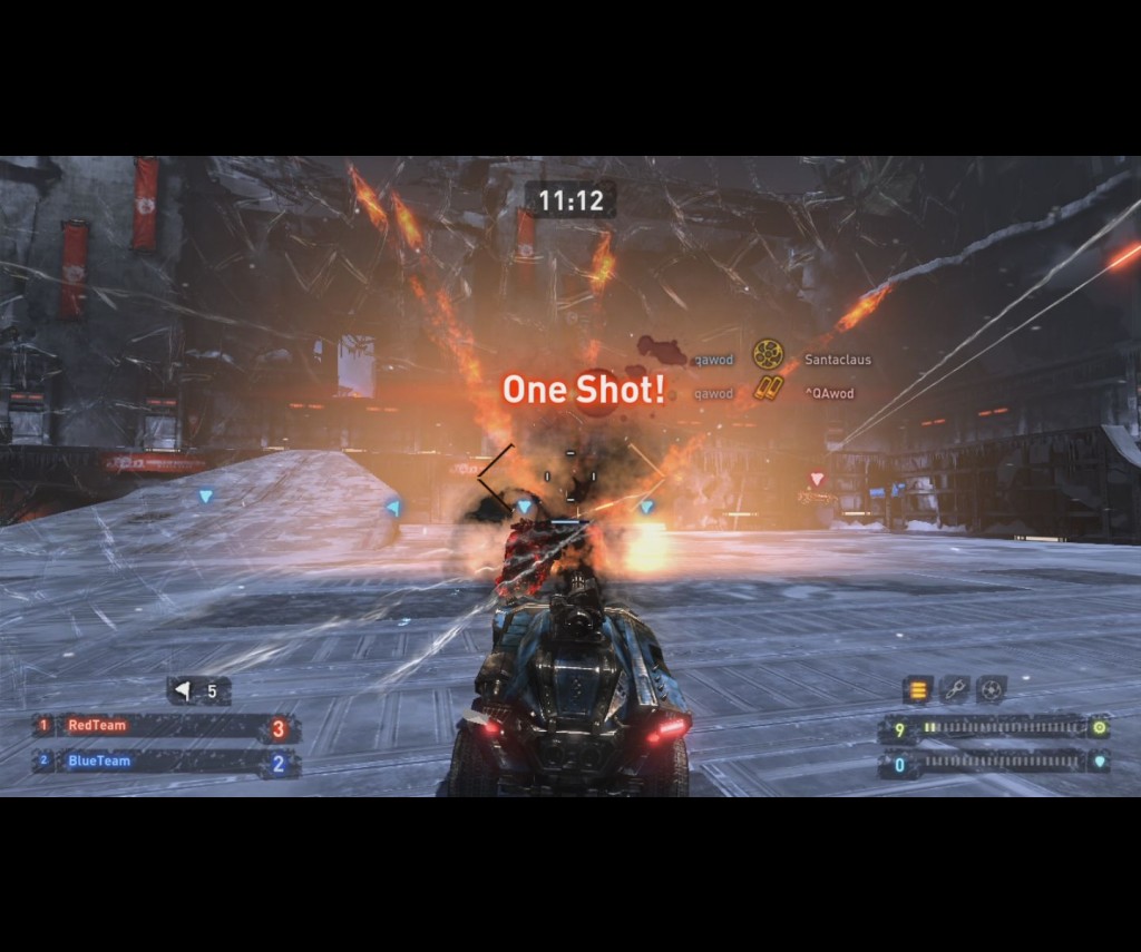 The right analogue stick aims your gun and also steers your car. That means that whatever you are aiming at, your car is turning towards it. The right analogue stick is completely inert and I feel that it should have been used for aiming, allowing you to race in one direction while firing in another. Or better yet: allowing you to shoot back at someone who is chasing you. This also means that you cannot aim up or down, which is a shame considering the multiple levels the game’s maps feature. The auto-aim occasionally locks onto targets from the other levels, but when you want to go down, there’s no way of knowing beforehand whether you are jumping down to another level or into the abyss.